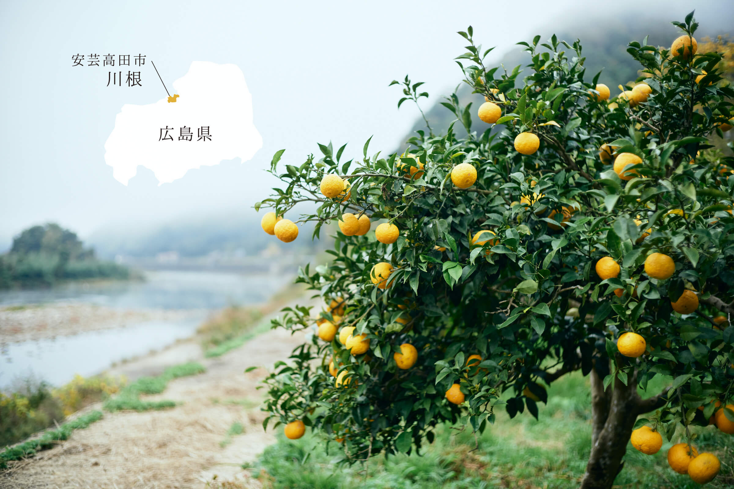 柚子は-9℃では成木が枯死し、-7℃では3年以下の幼木が枯死すると言われています。中国山地の山間部に位置し、冬の寒さ厳しい川根でゆずが育つのは、江の川に現れる川の霧に守られているから。厳しい環境の中で自然の立地に恵まれて育つ川根の柚子。こうして春夏秋冬を過ごし、また春に向けて力を蓄えていきます。